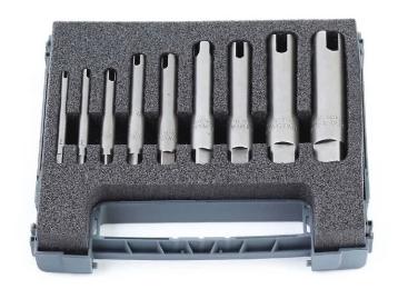 Tapudtrækkersæt M5-M22 indeholder de 9 mest almindelige størrelser gevindkroner med forskellige antal stænger.